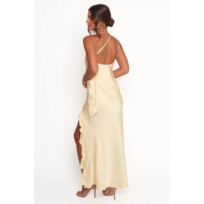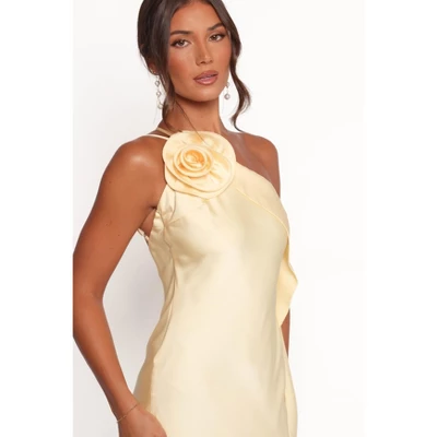 Turn heads with the Aila Rosette One Shoulder Dress in Butter Yellow. This elegant maxi dress is all about effortless sophistication, featuring a chic one-shoulder neckline and thin adjustable straps for the perfect fit.