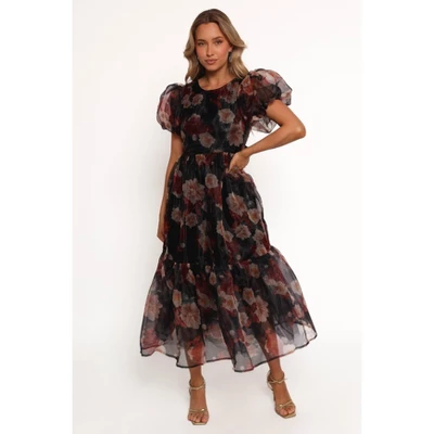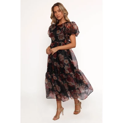 This stunning dress features a midi length that offers both elegance and comfort, making it perfect for any occasion out with friends. The high round neckline and short sleeves with elasticized cuffs provide a chic silhouette, while the playful back cut-out adds a modern twist.