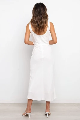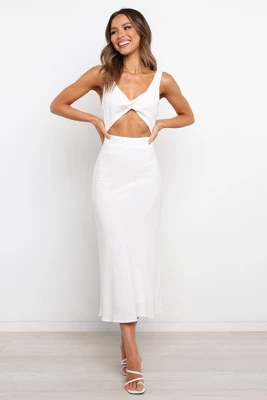 Take your style to new heights in this chic midi length dress! The flattering v neckline creates a timeless silhouette while the bust twist detail with cut out feature adds a touch of glamor. For an extra bit of security, the dress is finished off with a hook and eye clasp and invisible back zip.
