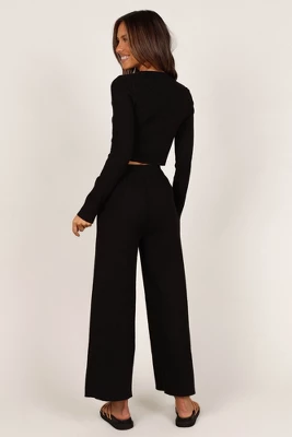 This cozy top and pant set is a must-have for your weekend wardrobe! Crafted in a stretch ribbed fabric, the cropped length top features a round neckline and long sleeves while the high waisted pants feature an elasticised waistband with drawstring tie and wide leg style.
